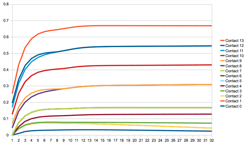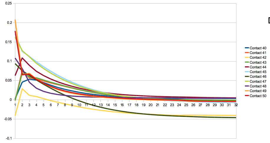 At a first glance, there seems to be no suprises here. Impulses form asymptotic curves towards their solution and there is not a lot of action after about twelve iterations. But look again, especially at the bright yellow curve, that seems to steadily decrease and form a non-horizontal asymptote, and what about the deviation around iteration eight and nine? Let's try a more complex exmple, with a box pyramid of five rows (15 boxes). There is around 90 contacts, and it would be too messy to show them all in the same graph, so I chose ten of them from the middle of the stack: