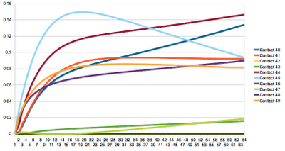 This is quite interesting - most of the curves are asymtotic to a non-horizontal line. Even at 64 iterations they have not found a stable configuration. Most interesting is maybe contact 45, which first goes up and then steadily decreases, while most othe contacts increase. Somehow, the solver is shifting around the weight. Maybe just because it can. Another graph we could study is the relative velocity along the normal direction (v from my previous post) and how it changes while iterating: